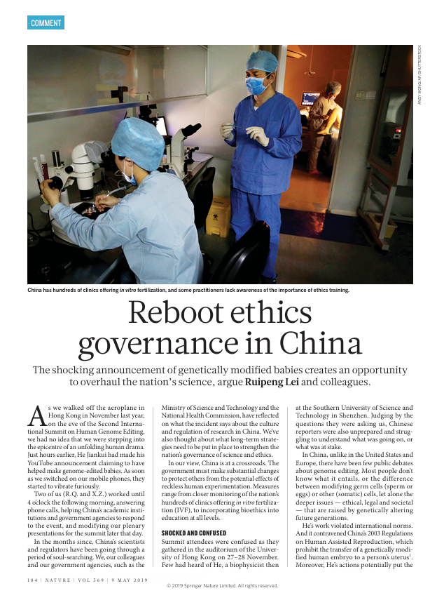 2019年5月9日在国际顶尖科学期刊Nature发表国内人文学科领域第一篇政策评论论文Reboot Ethics Governance in China(《重建中国的伦理治理》),提出“科技伦理治理”和“伦理先行”概念,并系统阐述科技伦理治理基本原则,相关概念和原则已被系列中央文件和两办《关于加强科技伦理治理的意见》采纳。