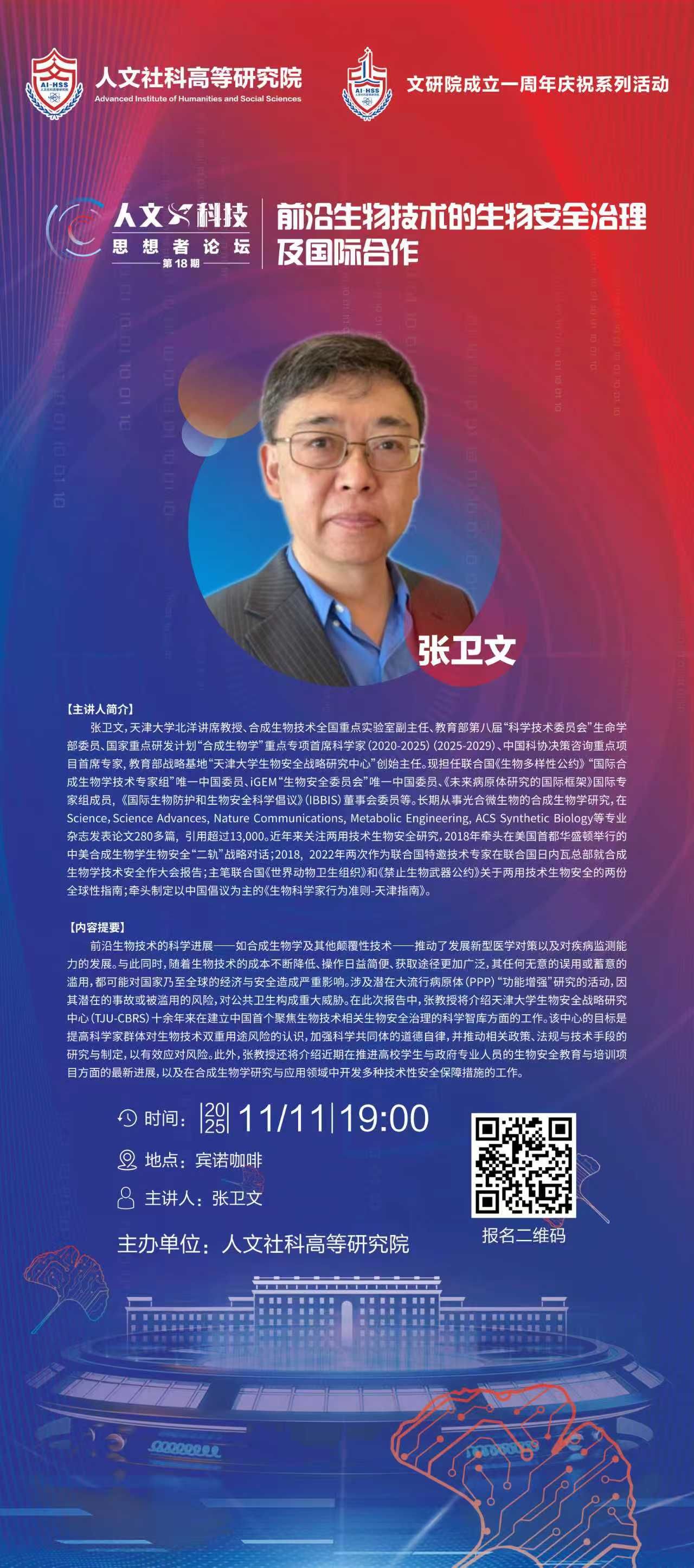 张卫文,天津大学北洋讲席教授、合成生物技术全国重点实验室副主任、教育部第八届“科学技术委员会”生命学部委员、国家重点研发计划“合成生物学”重点专项首席科学家(2020-2025) (2025-2029)、中国科协决策咨询重点项目首席专家,教育部战略基地“天津大学生物安全战略研究中心”创始主任。现担任联合国《生物多样性公约》“国际合成生物学技术专家组”唯一中国委员、iGEM“生物安全委员会”唯一中国委员、《未来病原体研究的国际框架》国际专家组成员, 《国际生物防护和生物安全科学倡议》(IBBIS)董事会委员等。长期从事光合微生物的合成生物学研究,在ScienceScience Advances, Nature Communications, Metabolic Engineering, ACS Synthetic Biology等专业杂志发表论文280多篇,引用超过13,000。近年来关注两用技术生物安全研究,2018年牵头在美国首都华盛顿举行的中美合成生物学生物安全“二轨”战略对话;2018、2022年两次作为联合国特邀技术专家在联合国日内瓦总部就合成生物学技术安全作大会报告;主笔联合国《世界动物卫生组织》和《禁止生物武器公约》关于两用技术生物安全的两份全球性指南;牵头制定以中国倡议为主的《生物科学家行为准则-天津指南》。