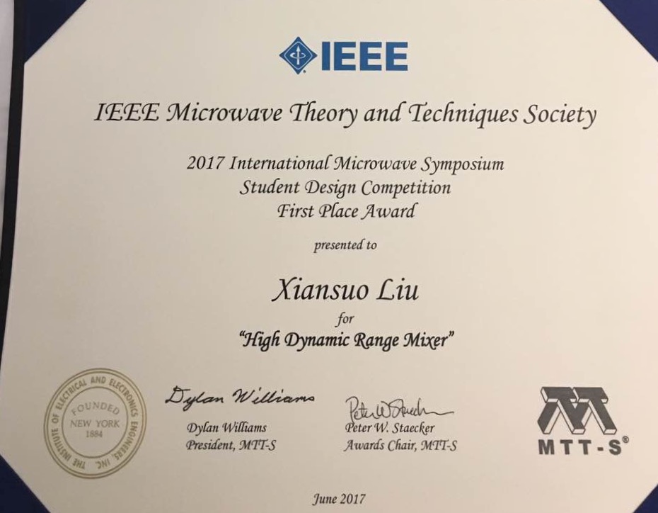 2017年度国际顶级会议:微波国际年会(IMS) 学生设计竞赛第一名