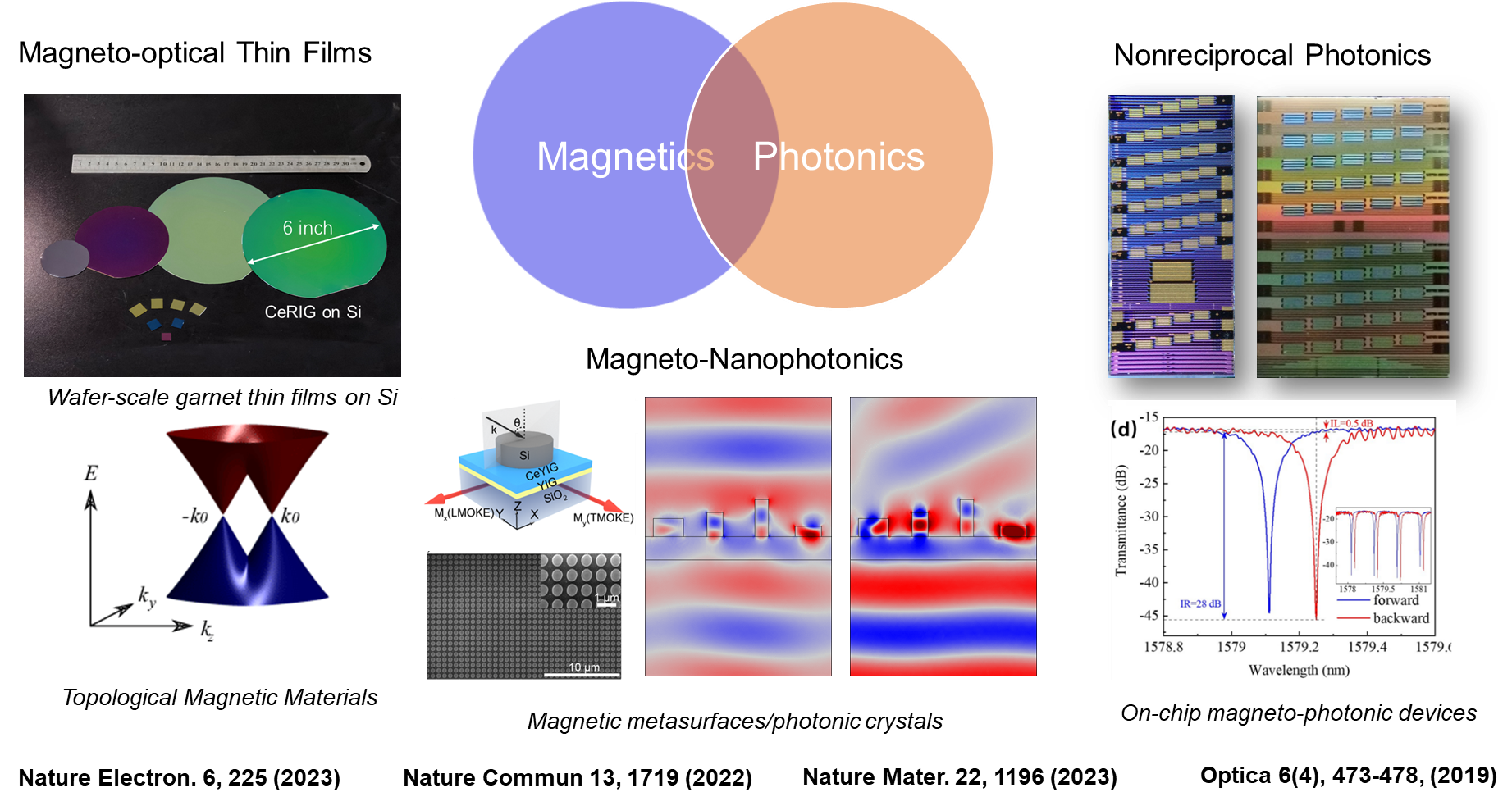 课题组致力于研究磁性微纳结构中的非互易光学效应新原理,发展硅基异质集成的磁光薄膜新材料,研制波导集成的非互易光学器件,研究非互易材料和器件的硅基异质集成技术,推动相关技术在光通信、数据通信、光传感等领域的应用。