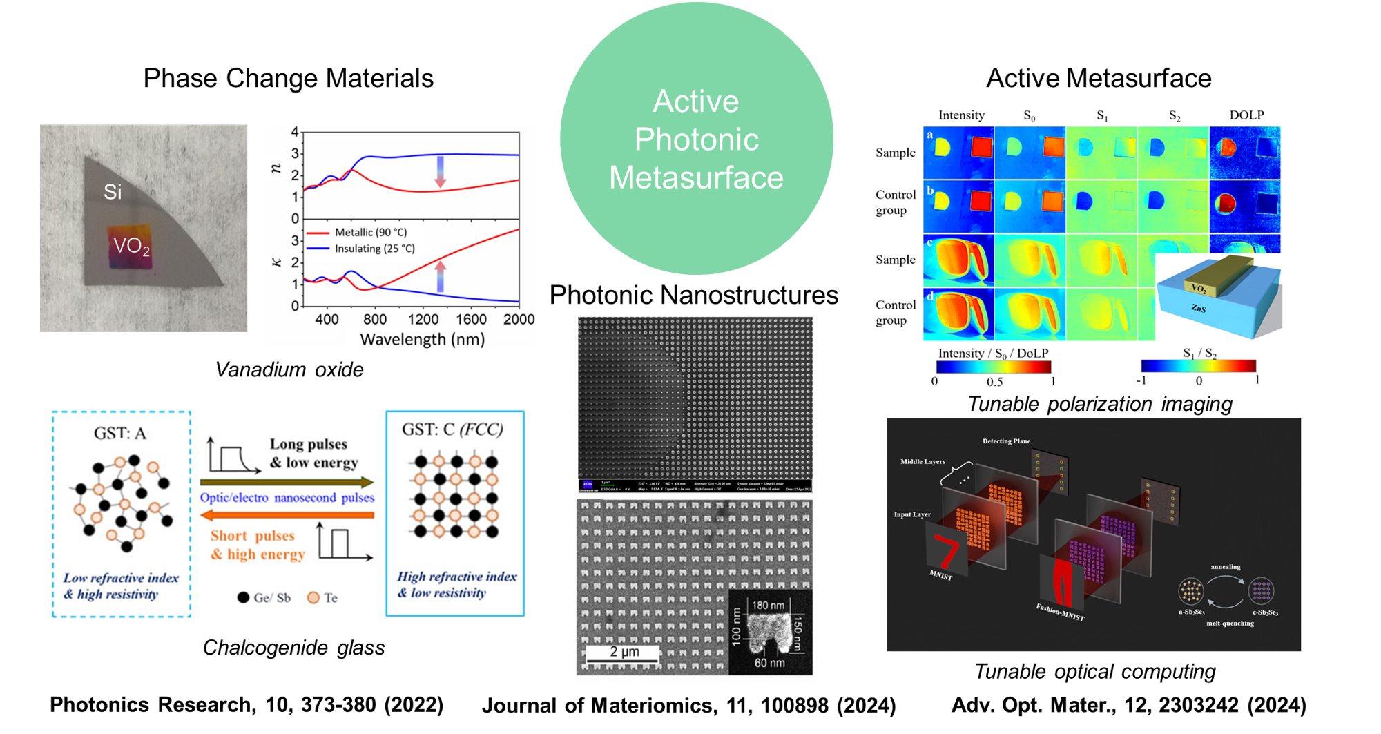 课题组致力于研究光学超表面中亚波长尺度光场调控机理,结合磁光、电光、相变等功能光学薄膜等微纳结构,发展智能可调的光学超表面器件,如可调偏振超表面、可变焦透镜和可重构衍射超表面等,推动相关技术在成像、光传感和光计算等领域的应用。