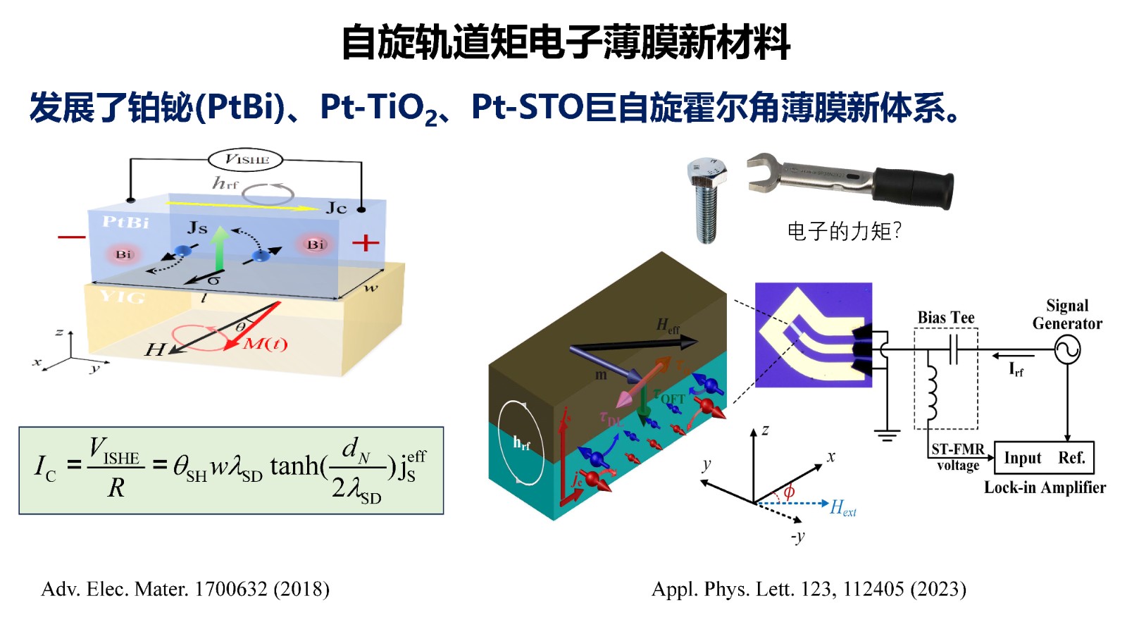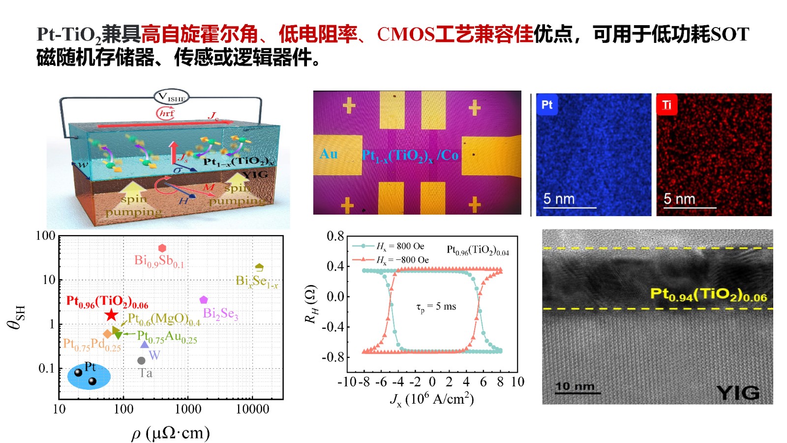 基于自旋轨道力矩(SOT)效应的新型磁随机存储器(MRAM)、存算一体器件受到国际广泛关注。SOT器件的功耗依赖于材料的“自旋流-电荷流”转换效率(自旋霍尔角)。目前,开发兼具高自旋霍尔角和低电阻率的薄膜材料仍是领域难点,我们提出和发明了巨自旋霍尔W/TaOx、Pt(TiO2)、Pt1-x(SrTiO3)x、PtBi、PtSn等系列薄膜新材料,实现了室温下巨大自旋霍尔角1.6(国际领先),将信息写入所需的电流密度降低约30倍(较纯Pt),SOT效率提升了1个数量级。新材料兼具巨自旋霍尔角、极低电阻率和良好的CMOS工艺兼容性,有效解决了SOT-MRAM芯片写入功耗高的瓶颈材料难题。