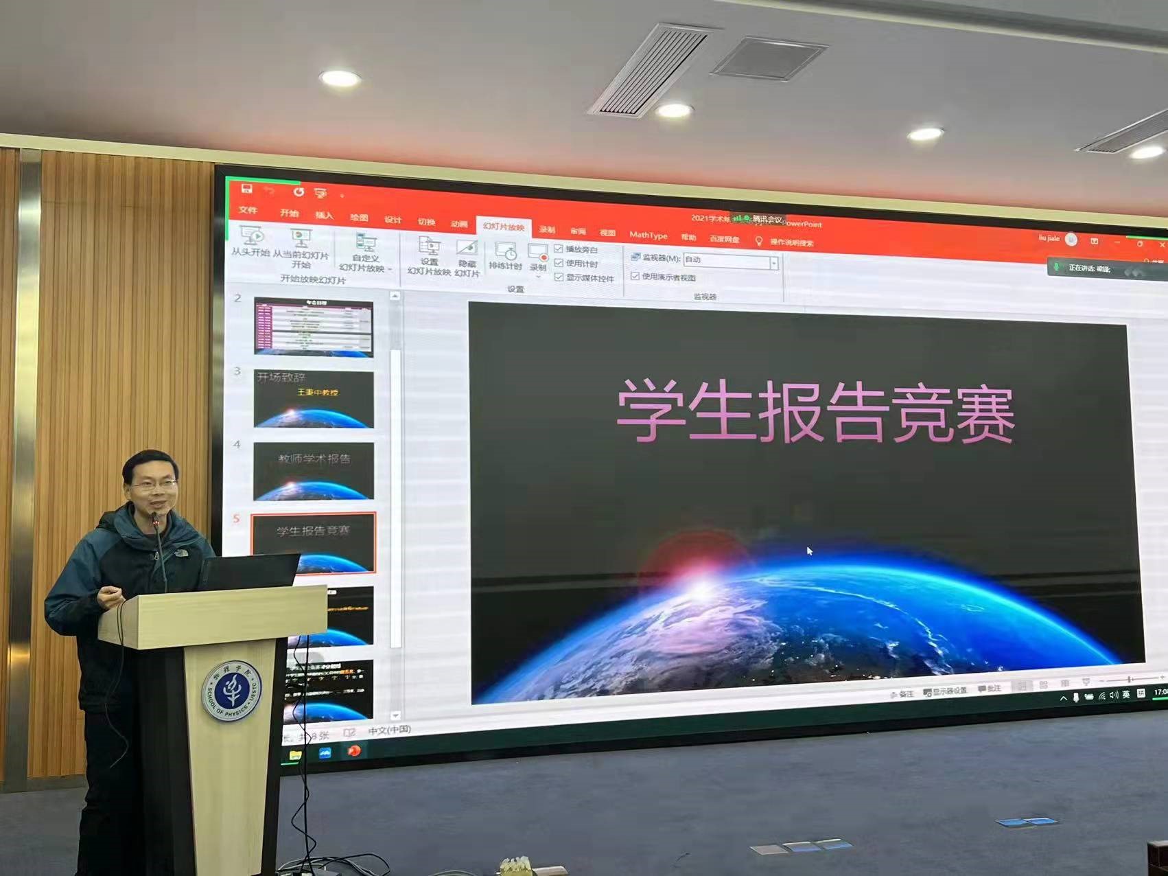 在下午的学生报告竞赛环节,杨刚、陈浩亮、岳书中、黄昊、周辉、张顺、余亚清、陈传升、王瑀、李欣婕十位同学依次上台作了每人限时15分钟的报告。演讲的同学都准备充分,神采奕然;在提问交流时间,在场师生就自己关心的问题进行了提问交流和评论。学生报告结束后,与会老师们对10个学生报告进行了评分,王秉中教授作了总结点评。最后举行了学生报告竞赛颁奖仪式。