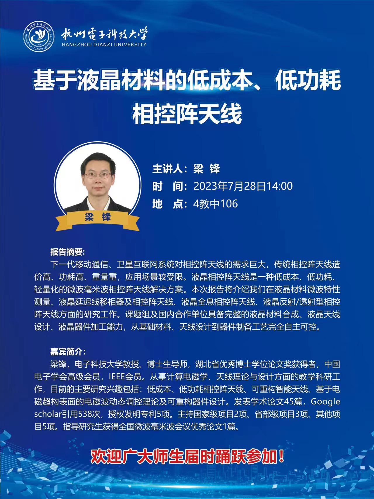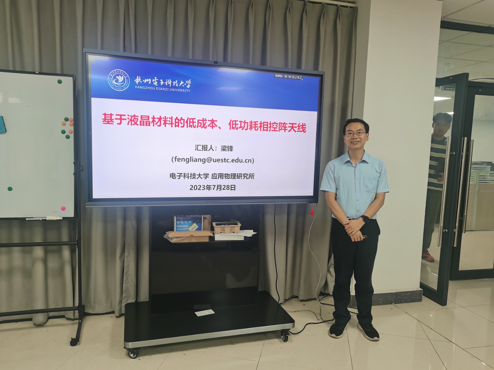 2023年7月28日下午,梁锋老师在杭州电子科技大学电子信息学院作了题为“基于液晶材料的低成本、低功耗相控阵天线”的学术报告,国家优秀青年科学基金获得者、杭州电子科技大学电子信息学院副院长赵文生教授主持报告会。报告结束后,梁锋老师和与会师生进行了深入的交流和讨论。