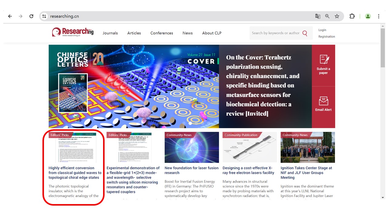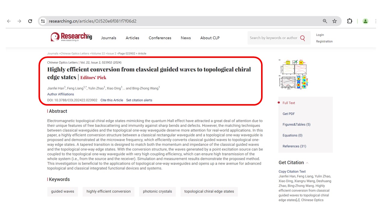 韩建飞同学的论文Jianfei Han,Feng Liang*, Yulin Zhao, Xiao Ding, Xiangru Wang*, Deshuang Zhao, and Bing-Zhong Wang, "Highly efficient conversion from classical guided waves to topological chiral edge states",Chinese Optics Letters, vol. 22, no. 2, 023902, 2024 入选Editor's Pick(主编精选),祝贺韩建飞!也感谢Chinese Optics Letters编辑团队对我们工作的认可!