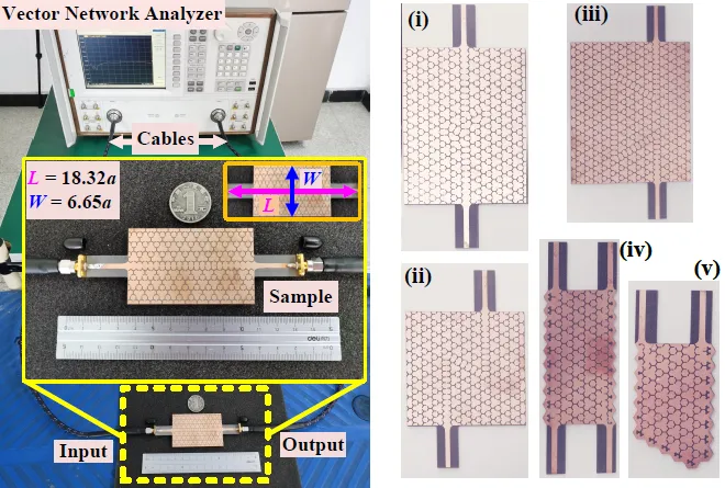图5多模传输基片集成拓扑光子晶体波导加工样品及测试场景