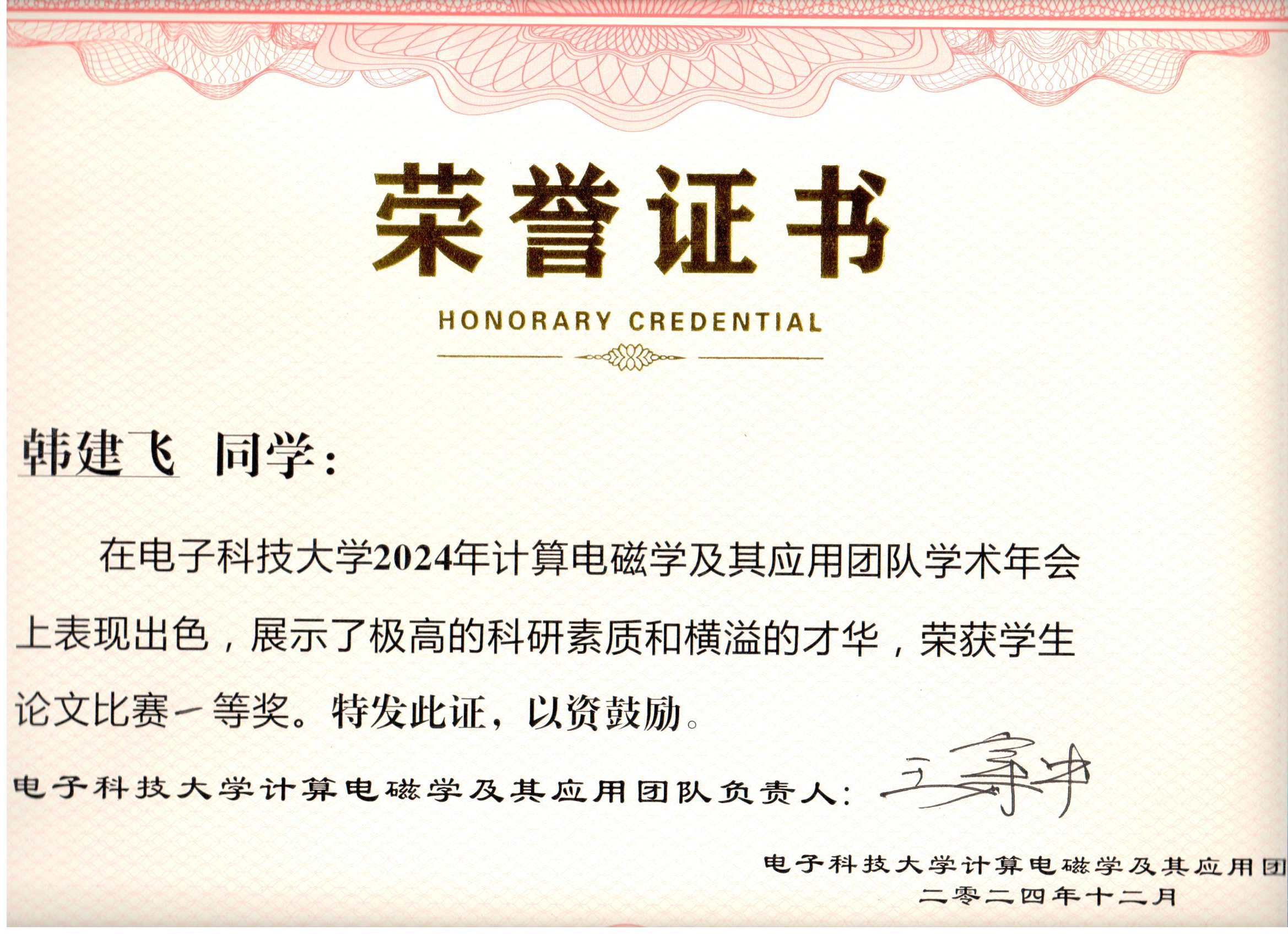 课题组韩建飞同学荣获计算电磁学及其应用团队2024年学术年会论文竞赛一等奖(2024.12)