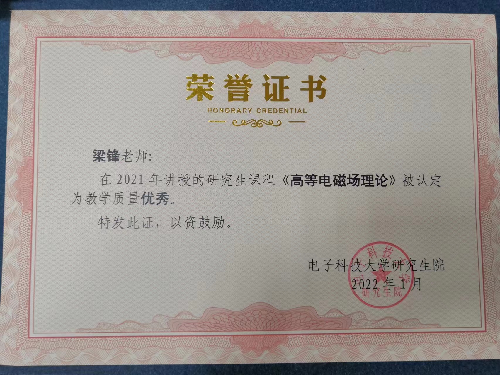 成果简介:2021年秋季学期讲授的研究生课程《高等电磁场理论》被认定为教学质量优秀。