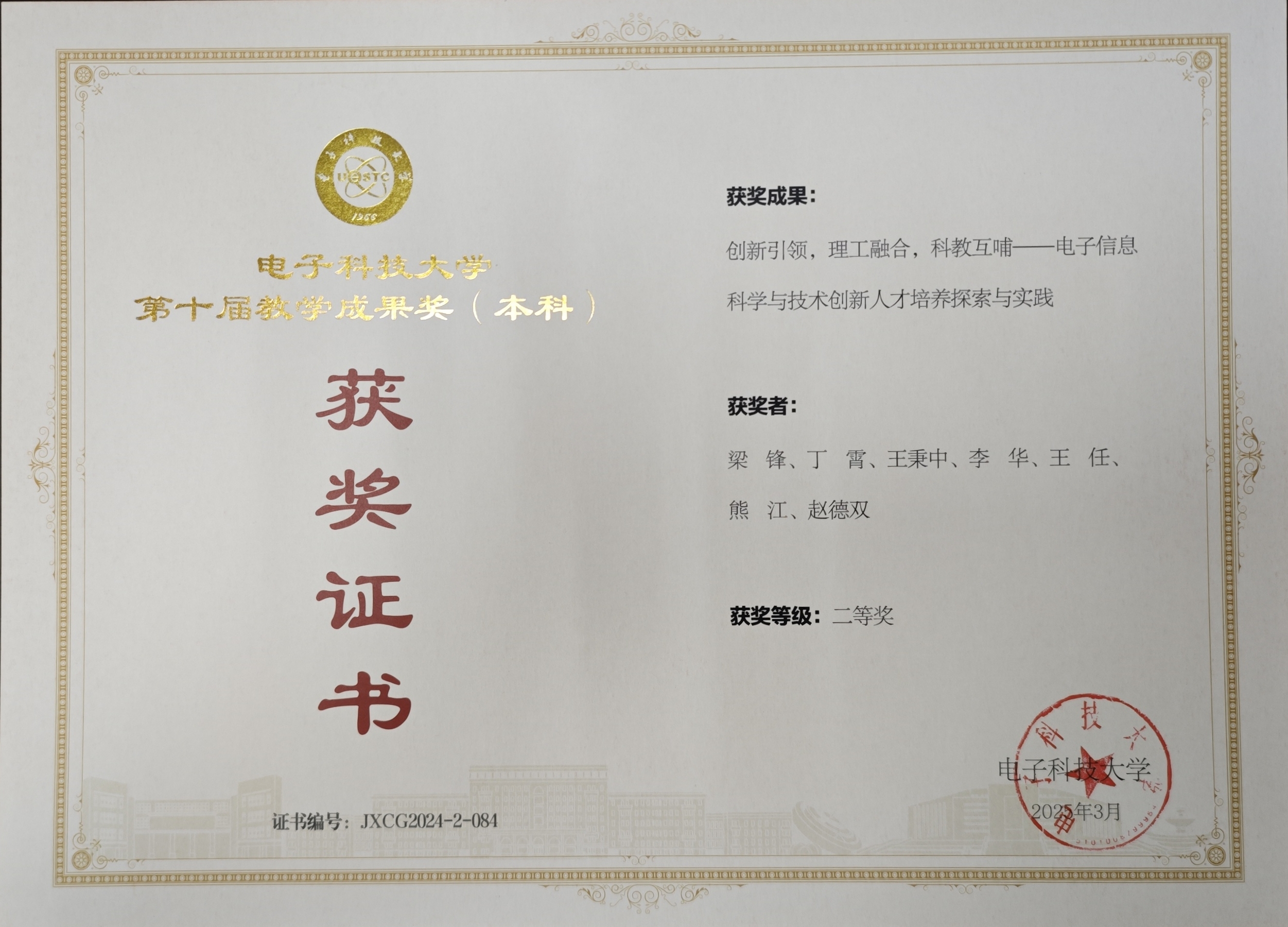 电子科技大学第十届教学成果奖二等奖(排名1)