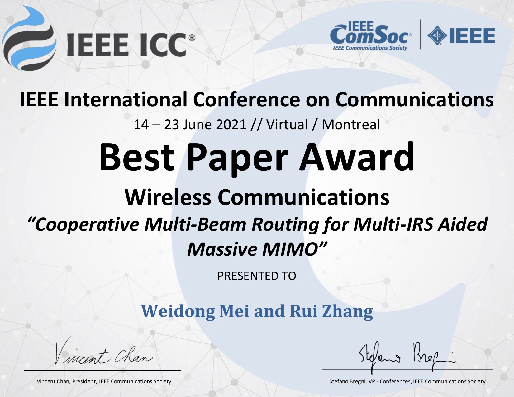 曾获荣誉:2021年国际通信大会(ICC)最佳论文奖