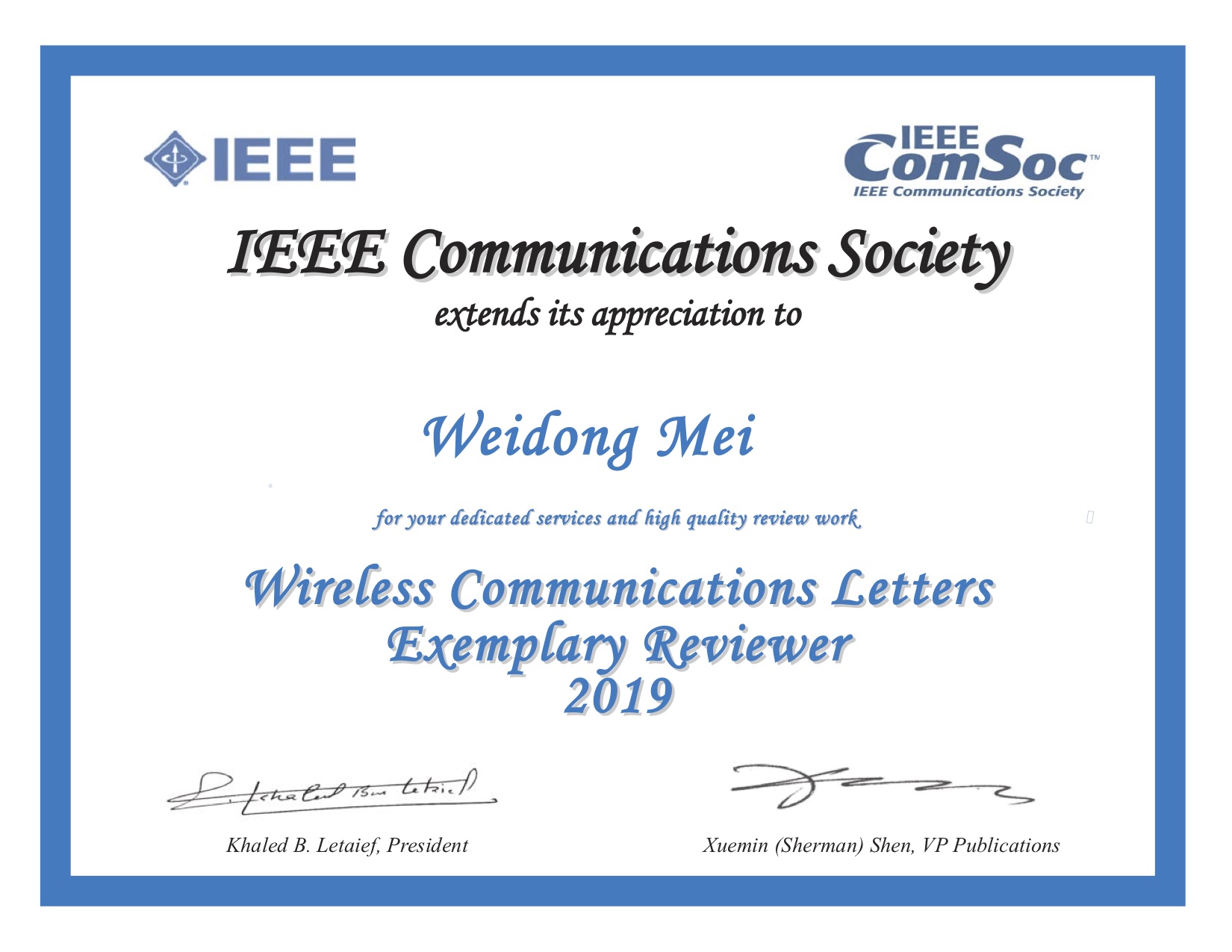 2019年IEEE WCL期刊模范审稿人