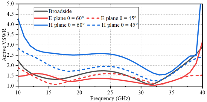 8×8阵列样机见图1。该天线在3.28:1的超宽带下可以实现在E/H面扫描至±60°时驻波小于3,见图2。该天线实现了双线极化辐射,单元间距为0.484λH×0.484λH,剖面高度为0.366λH,最高工作频率达到了V频段,并且经过了加工验证,测量结果和仿真结果合理吻合。
