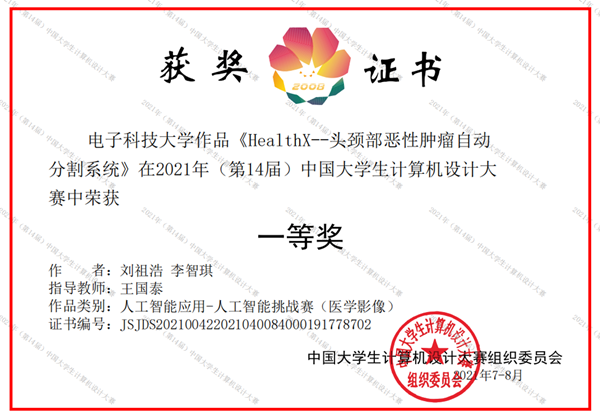 介绍:电子科技大学格拉斯哥学院2018级本科生。2019.03-2022.03在本实验室参与科研项目,期间以第一作者身份在医学图像分析领域顶级会议MICCAI 2020、ISBI 2020发表研究论文两篇,在领域重要期刊Medical Physics发表论文一篇。2020年获得商汤奖学金(全国仅21个名额),2021年获中国大学生计算机设计大赛全国一等奖。