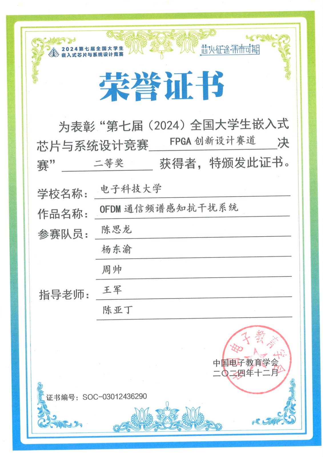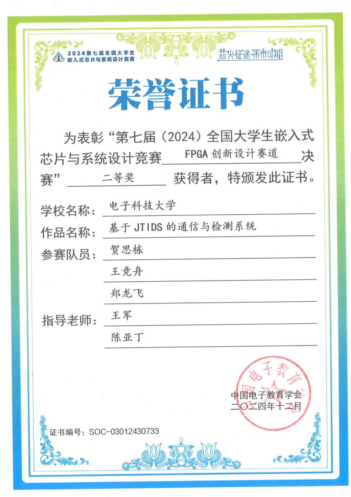 在“第七届(2024)全国大学生嵌入式芯片与系统设计竞赛FPGA创新设计赛道决赛”中,项目组王竞舟、贺思栋、陈思龙、周帅、郑龙飞、杨东渝获得二等奖。