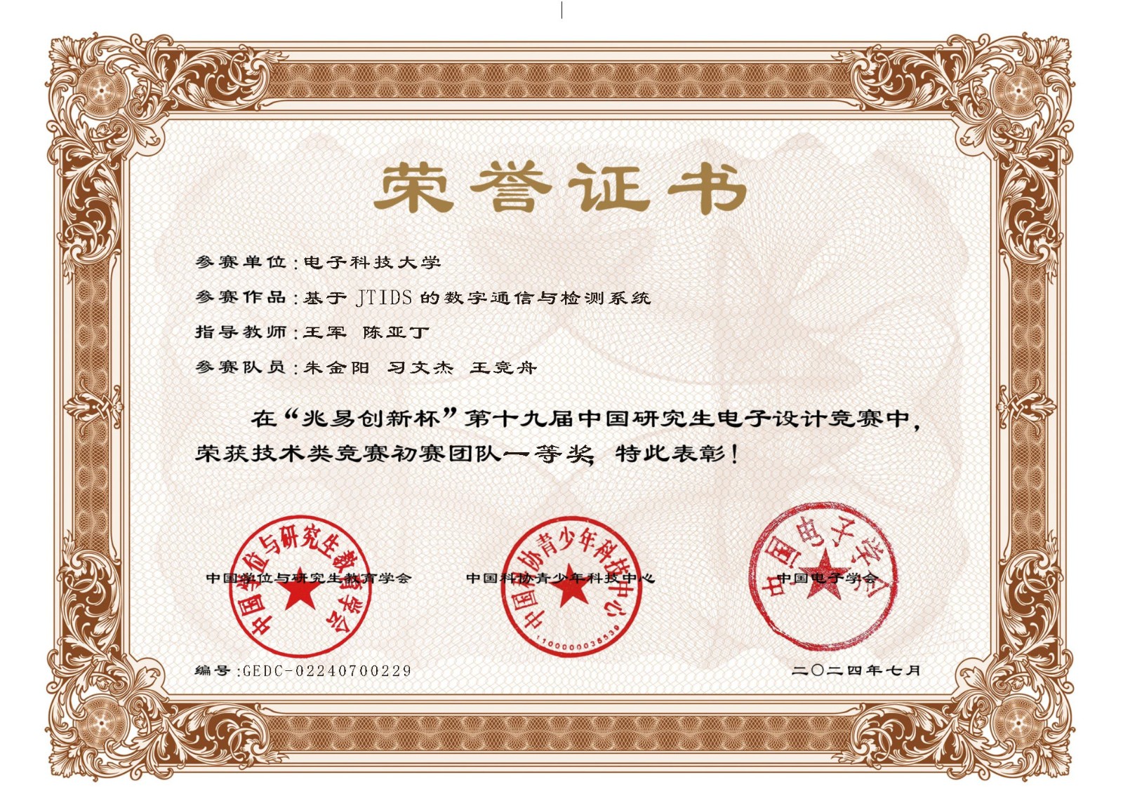 项目组习文杰、王竞舟、朱金阳同学在“兆易创新杯”第十九届中国研究生电子设计竞赛中,荣获技术类竞赛初赛团队一等奖。
