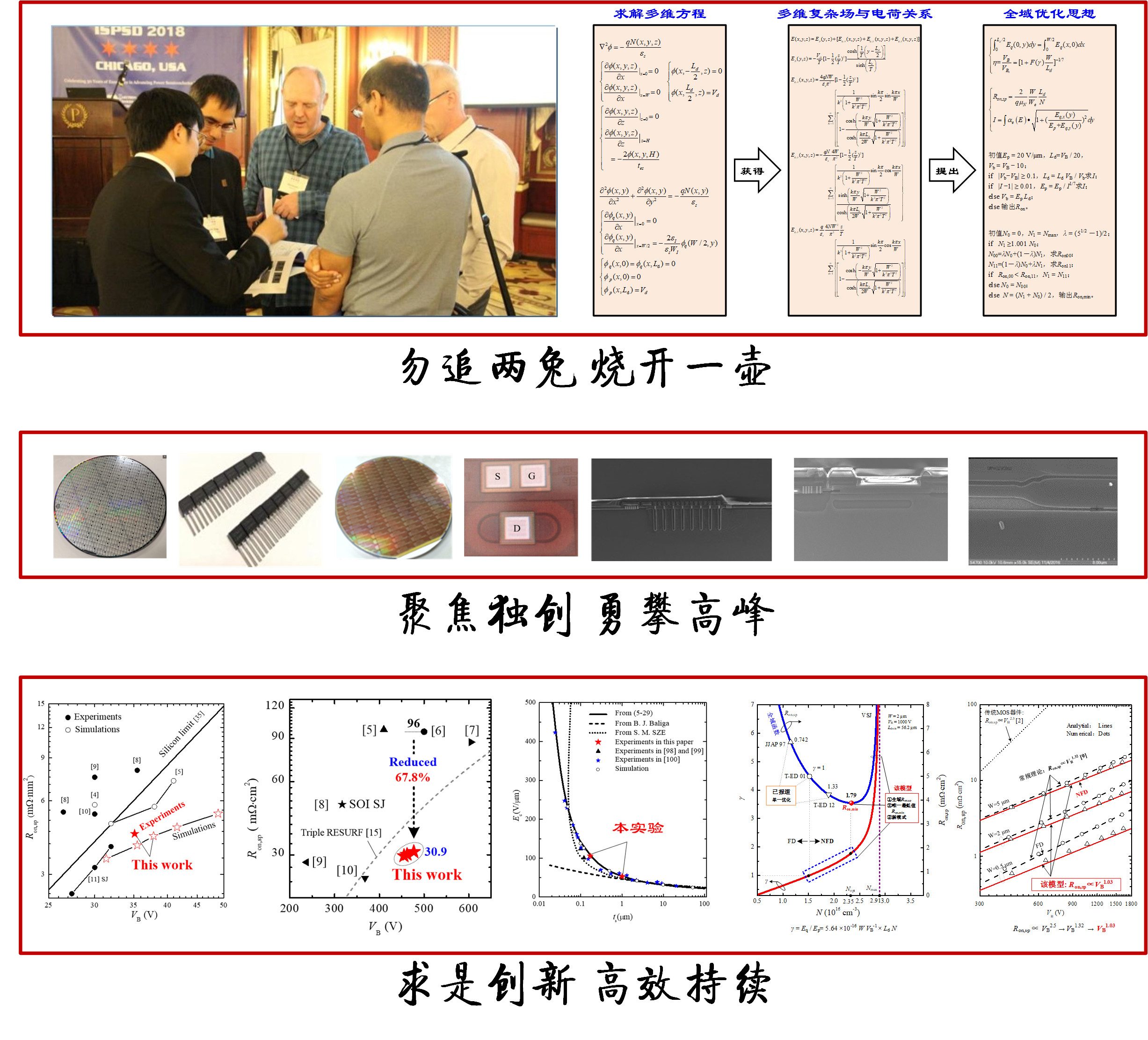 (1)提出超结器件最低比导通电阻Ron,min理论,包括“三新”:新模式(NFD模式)、新模型(ES模型)和新方法(Ron,min法);获得理论最低比导通电阻Ron,min,使半导体材料实现理想“准线性”关系。理论指导研制的横向超结器件Ron,sp较同类器件降低67.8%