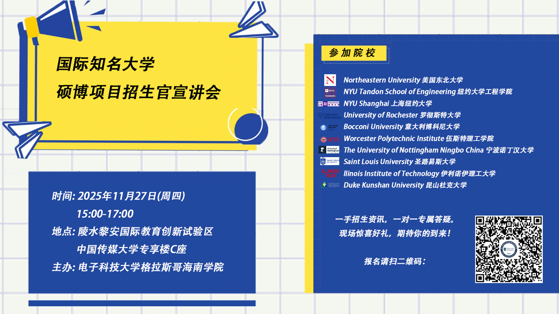 结合留学指导服务季,11月格拉斯哥海南学院留学指导中心重磅推出:“2025申请季招生官面对面”系列活动,将继续为同学们安排多场线上与线下的国际知名高校招生官宣讲会,助力2025申请季的留学规划。这些宣讲会将帮助同学们全面了解海外深造的各项关键信息。