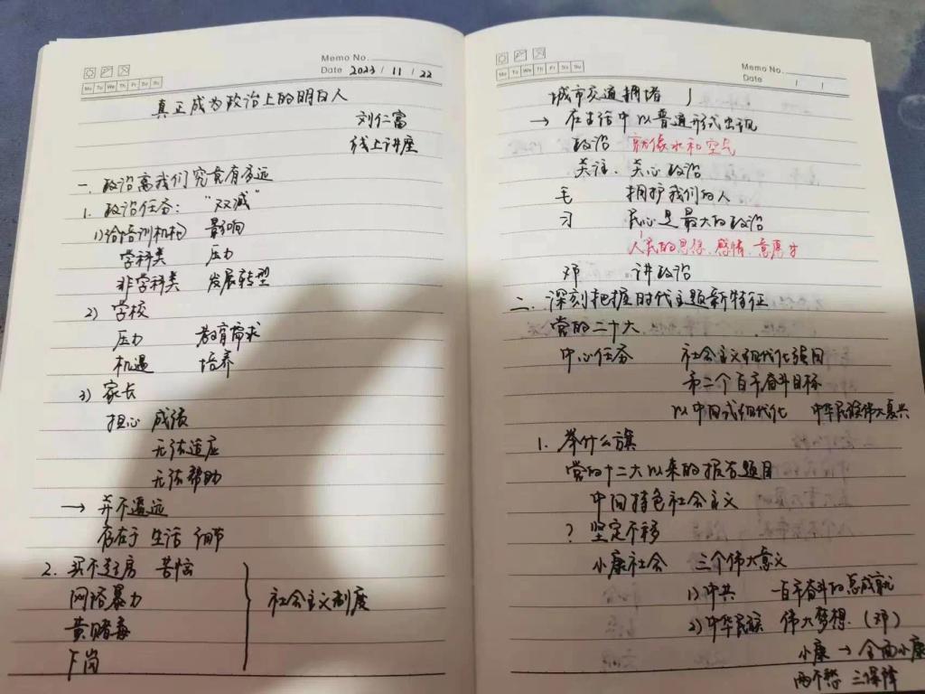 刘仁富老师从政治离我们有多远入手,以“双减”政策为例,指出政治就像水和空气,不仅是那些“远在天边”的大问题,还在生活中以普通存在的形式出现。接着,从举什么旗、走什么路、以什么样的精神状态、实现什么样的奋斗目标就深刻把握时代主题新特征作出详细解释。最后,刘老师运用党的历史、名人轶事、寓言故事等,重点围绕如何切实提升政治判断力、政治领悟力、政治执行力三个方面进行深刻阐述。