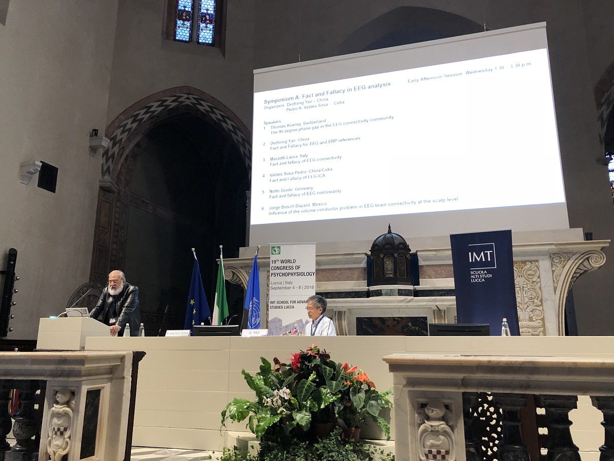 本次会议期间,尧德中教授应邀做大会报告“Peer into Epilepsy with Simultaneous EEG and fMRI”,系统的介绍了团队在同步脑电-功能磁共振融合技术及其在癫痫机制研究中的研究成果,并与国际同行们展开了深入的交流。此外,我校Pedro A. Valdes-Sosa与尧德中教授还应邀主持“Fact and Fallacy in EEG analysis”分会场会议,邀请了6位该领域国际知名专家做报告,就脑电的参考电极、脑电独立成分分析、脑电中的非线性分析、脑电源定位等问题进行了热烈讨论。