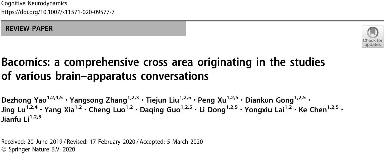 大脑是人体最重要的单元,大脑与器物(apparatus)之间的交互不仅可以揭示大脑功能正常与否,同时还可以调节大脑。此处的“器物”,可以是一种非生物器械,如计算机,相应的脑(计算)机接口(Braincomputerinterface-BCI)是当前非常热门的研究领域,也有了多种应用。但“器物”也可以是一个生物器官或系统,如肠道、肌肉、心脏、外周神经等,它们与大脑间的有效交流对健康生活至关重要。那么,这些看似不同的交互场景是否有一些共同的基础?在本文中,我们提出建立一个新的交叉学科:脑器交互学,其英文由脑-器交互(brainapparatusconversations)的缩写BAC和组学(omics)结合而成(Bacomics)。