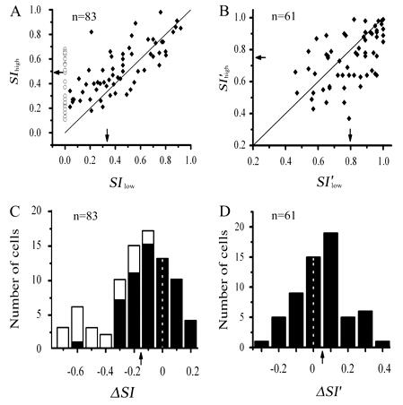 Ke Chen, Xuemei Song, Chaoyi Li. "Contrast-Dependent Variations in the Excitatory Classical Receptive Field and Suppressive Nonclassical Receptive Field of Cat Primary Visual Cortex."Cerebral Cortex, 23(2): 283-292, 2012. In area V1 of cat and monkey, there is a surround region beyond the classical receptive field (CRF) which alone is unresponsive but may modulate the cell's response. This field is referred to as the "nonclassical receptive field" (nCRF). It has been reported in monkey that the extent of CRF and/or nCRF of V1 neurons is not fixed but varies with stimulus contrast. We reexamined the contrast dependence of V1 neurons in cat to determine whether this differs from previous studies in macaque. By fitting the spatial summation curves obtained at different contrasts with a difference of Gaussians model, we estimated quantitatively the effect of contrast on the spatial extent of the CRF and nCRF as well as the strength of surround suppression. Our results showed that both the CRF and nCRF expanded at low contrast, but the expansion is more marked for the CRF than for the nCRF. Although the effect of contrast on surround suppression was varied, the overall suppression increased significantly at high contrast. Moreover, the contrast-dependent change in the extent of CRF is independent of the change in suppression strength. Overall, our results in cat are in agreement with those obtained in macaque money. |