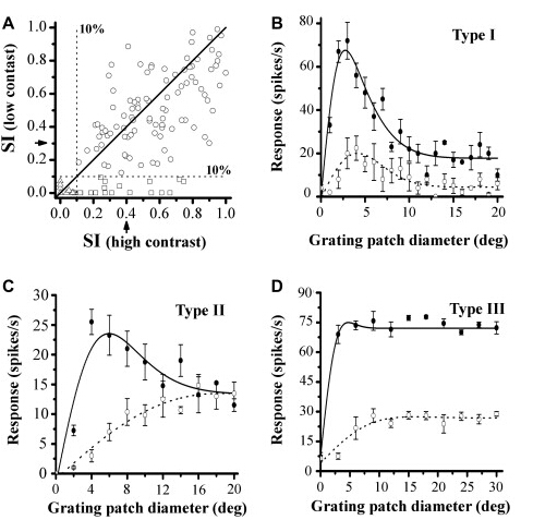 Ke Chen, Xue-Mei Song, Zheng-Qiang Dai, Jiao-Jiao Yin, Xing-Zhen Xu, Chao-Yi Li. "The spatial summation characteristics of three categories of V1 neurons differing in non-classical receptive field modulation properties." Vision Research, 96:87–95,2014 The spatial summation of excitation and inhibition determines the final output of neurons in the cat V1. To characterize the spatial extent of the excitatory classical receptive field (CRF) and inhibitory non-classical receptive field (nCRF) areas, we examined the spatial summation properties of 169 neurons in cat V1 at high (20–90%) and low (5–15%) stimulus contrasts. Three categories were classified based on the difference in the contrast dependency of the surround suppression. We discovered that the three categories significantly differed in CRF size, peak firing rate, and the proportion of simple/complex cell number. The classification of simple and complex cells was determined at both high and low contrasts. While the majority of V1 neurons had stable modulation ratios in their responses, 10 cells (6.2%) in our sample crossed the classification boundary under different stimulus contrasts. No significant difference was found in the size of the CRF between simple and complex cells. Further comparisons in each category determined that the CRFs for complex cells were significantly larger than those for simple cells in category type I neurons, with no significant differences between simple and complex cells in category type II and type III neurons. In addition, complex cells have higher peak firing rates than simple cells. |