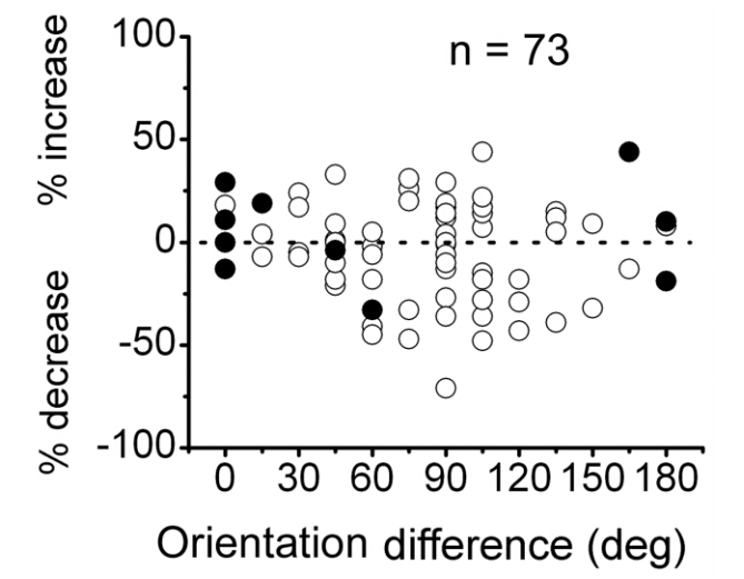 Tao Xu, Ling Wang, Xue-Mei Song, Chao-Yi Li. "The Detection of Orientation Continuity and Discontinuity by Cat V1 Neurons."Plos One. 8(11), e79723, 2013.[pdf] The orientation tuning properties of the non-classical receptive field (nCRF or "surround") relative to that of the classical receptive field (CRF or "center") were tested for 119 neurons in the cat primary visual cortex (V1). The stimuli were concentric sinusoidal gratings generated on a computer screen with the center grating presented at an optimal orientation to stimulate the CRF and the surround grating with variable orientations stimulating the nCRF. Based on the presence or absence of surround suppression, measured by the suppression index at the optimal orientation of the cells, we subdivided the neurons into two categories: surround-suppressive (SS) cells and surround-non-suppressive (SN) cells. When stimulated with an optimally oriented grating centered at CRF, the SS cells showed increasing surround suppression when the stimulus grating was expanded beyond the boundary of the CRF, whereas for the SN cells, expanding the stimulus grating beyond the CRF caused no suppression of the center response. For the SS cells, strength of surround suppression was dependent on the relative orientation between CRF and nCRF: an iso-orientation grating over center and surround at the optimal orientation evoked strongest suppression and a surround grating orthogonal to the optimal center grating evoked the weakest or no suppression. By contrast, the SN cells showed slightly increased responses to an iso-orientation stimulus and weak suppression to orthogonal surround gratings. This iso-/orthogonal orientation selectivity between center and surround was analyzed in 22 SN and 97 SS cells, and for the two types of cells, the different center-surround orientation selectivity was dependent on the suppressive strength of the cells. We conclude that SN cells are suitable to detect orientation continuity or similarity between CRF and nCRF, whereas the SS cells are adapted to the detection of discontinuity or differences in orientation between CRF and nCRF. |