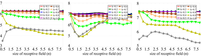 ![]() The influence of receptive field size (σ) and the cone weight (k) of our model (DOCC-LMS(sum)) on the measure of median angular error. Left: Gehler-Shi dataset, middle: SFU lab dataset, right: SFU HDR dataset.For experimental evaluation, in this study we respectively set k = 1.0, 1.0, 1.0 and σ = 0.5, 1.5, 8.0 for Gehler-Shi dataset, SFU lab dataset, and SFU HDR dataset. |