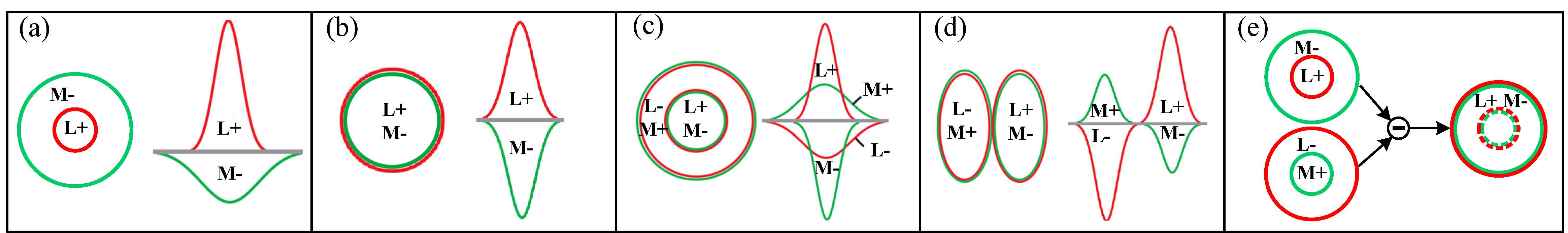 The receptive fields of single-opponent cells of Type I (a) and Type II (b) in RGC and LGN levels, and double-opponent cells in V1 with concentric RF(c) and oriented double-opponent cells in V1 with side-by-side spatially antagonistic regions with unbalanced cone weights (d). (e) An illustration to explain that the center-only RF of Type II in LGN is constructed by differencing two center-surround ganglion cells. |