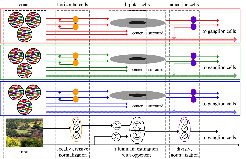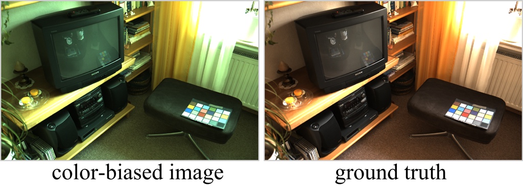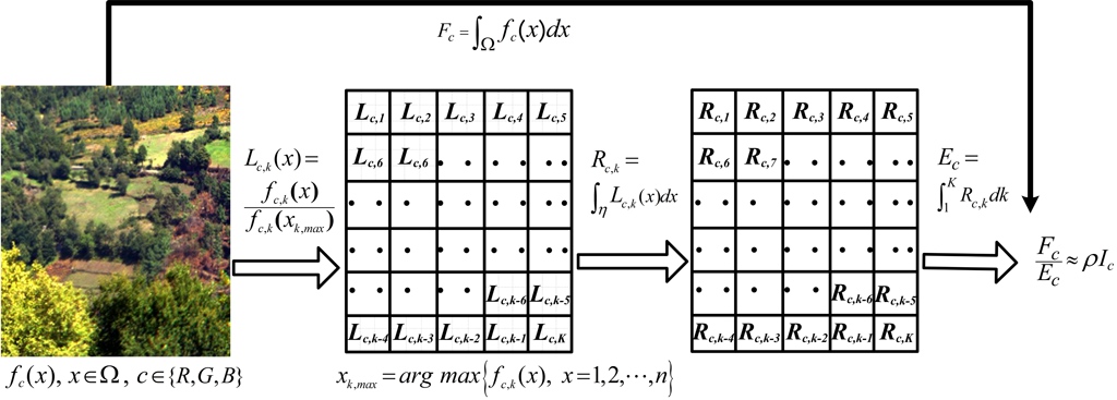 AbstractThe aim of computational color constancy is to estimate the actual surface color in an acquired scene disregarding its illuminant. Many solutions try to first estimate the illuminant and then correct the image with the illuminant estimate. Based on the linear image formation model, we propose in this work a new strategy to estimate the illuminant. Inspired by the feedback modulation from horizontal cells to the cones in the retina, we first normalize each local patch with its local maximum to obtain the so-called locally normalized reflectance estimate (LNRE). Then, we experimentally found that the ratio of the global summation of true surface reflectance to the global summation of LNRE in a scene is approximately achromatic for both indoor and outdoor scenes. Based on this substantial observation, we estimate the illuminant by computing the ratio of the global summation of the intensities to the global summation of the locally normalized intensities of the color-biased image. The proposed model has only one free parameter and requires no explicit training with learning-based approach. Experimental results on four commonly used datasets show that our model can produce competitive or even better results compared to the state-of-the-art approaches with low computational cost. |