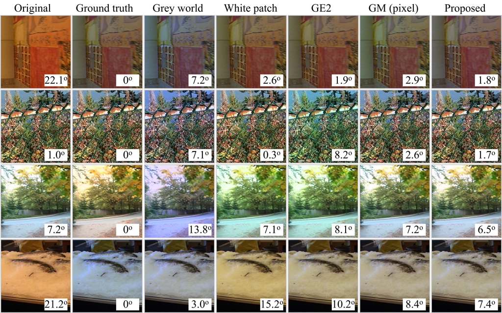 Results of several algorithms, the angular error is given on the lower right corner of image. |