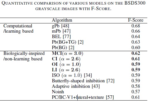 AbstractTo effectively perform visual tasks like detecting contours, the visual system normally needs to integrate multiple visual features. Sufficient physiological studies have revealed that for a large number of neurons in the primary visual cortex (V1) of monkeys and cats, neuronal responses elicited by the stimuli placed within the classical receptive field (CRF) are substantially modulated, normally inhibited, when difference exists between the CRF and its surround, namely, non-classical receptive field (non-CRF), for various local features. The exquisite sensitivity of V1 neurons to the center-surround stimulus configuration is thought to serve important perceptual functions including contour detection. In this work, we propose a biologically motivated model to improve the performance of perceptually salient contour detection. The main contribution is the multifeature-based center-surround framework, in which the surround inhibition weights of individual features, including orientation, luminance and luminance contrast, are combined according to a scale-guided strategy, and the combined weights are then used to modulate the final surround inhibition of the neurons. The performance was compared with that of single-cue-based models and other existing methods (especially other biologically motivated ones). The results show that combining multiple cues can substantially improve the performance of contour detection compared to the models using single cue. In general, luminance and luminance contrast contribute much more than orientation to the specific task of contour extraction, at least in grey-scale natural images. |