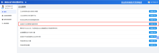 2、通过身份认证登录后,选择“全国技术合同管理与服务系统”。注意:不得擅自修改密码!!!