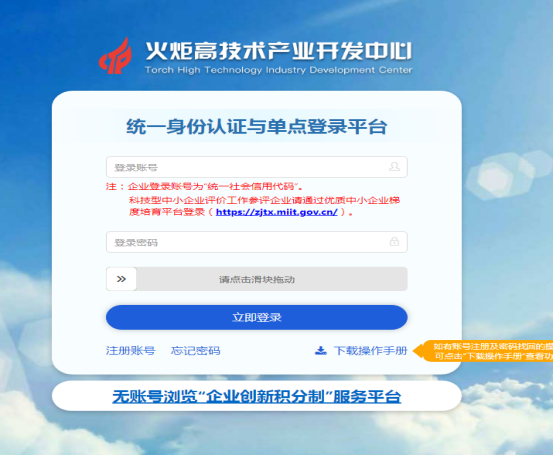1、登录火炬高技术产业开发中心“统一身份认证与单点登录平台”(https://hjrz.chinatorch.org.cn/login),登录账号为学校统一社会信用代码,登录账号和登录密码到各学院科研科查询获得。