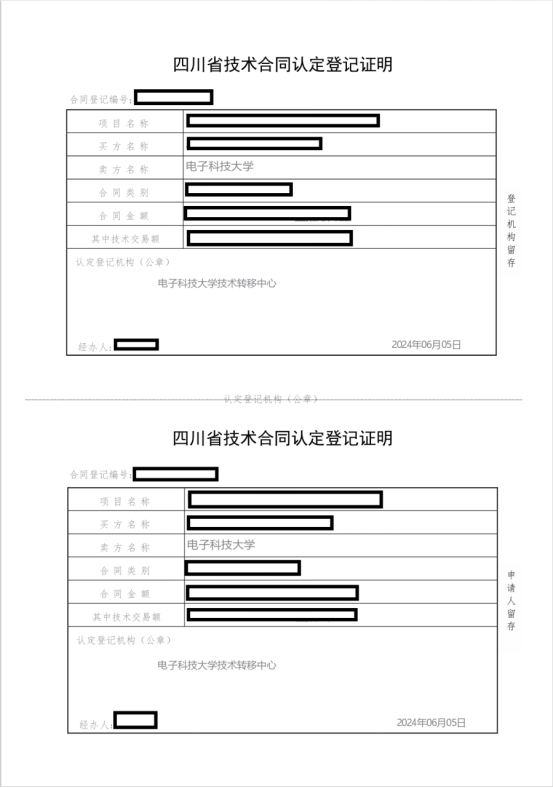 第一种:按甲方要求提供登记证明文件:乙方项目人员在系统中打印“登记证明1”和“登记证明2”,到主楼B2-406在“登记证明1”上加盖“四川省技术合同登记专用章”,“登记证明2”上加盖“电子科技大学技术转移中心公章”即可。