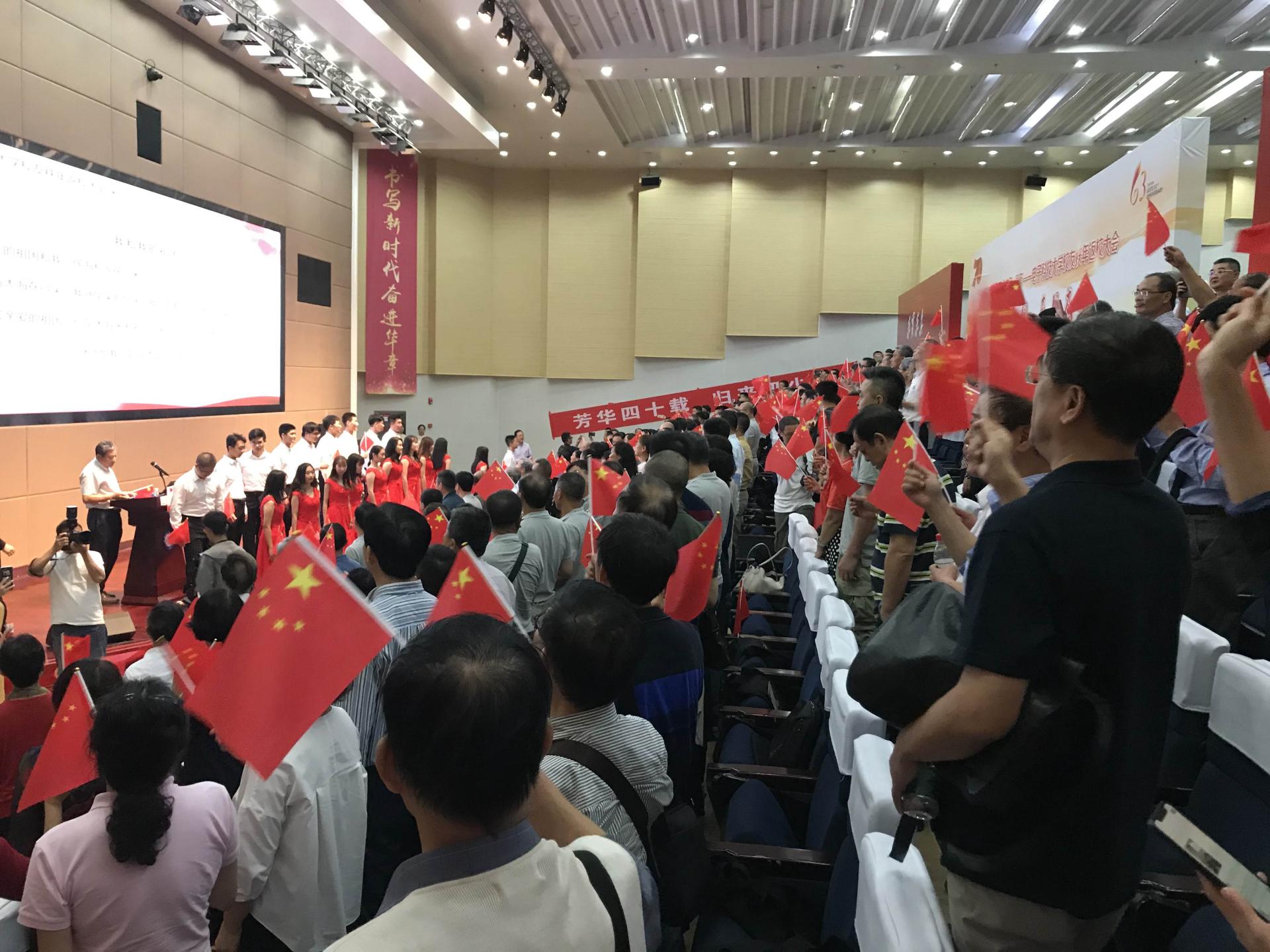 16:00,校友们参加了学校校庆秩年返校大会。会议开始前,学校送给校友们一段珍贵怀旧视频,记忆中的场景再现,掌声、欢笑声不断。王亚非书记致辞并介绍了学校情况,吴飞舟等校友作为代表进行了发言;我院校友在会上朗诵了同学为学校写的诗歌,表达了对母校的无限深情。校友代表向当年的任课老师们献上的感恩鲜花。大会在师生合唱《我和我的祖国》中落下帷幕。