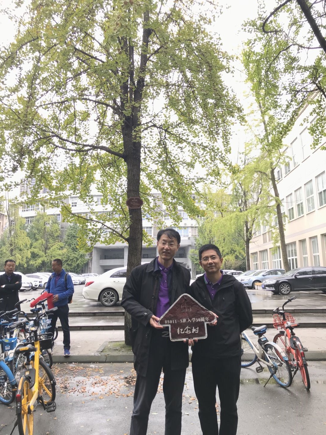 15:00,校友一行来到沙河校区,因就读时期在沙河,成电情怀更多也在沙河。以主楼为中心进行汇合,并合影留下珍贵镜头。接着来到逸夫楼门前,班级认养的银杏树下。距上一次入学30周年聚会,时隔4年再回,认养的小树已经长高许多,尤其银杏果挂满枝头,大家更觉开心。