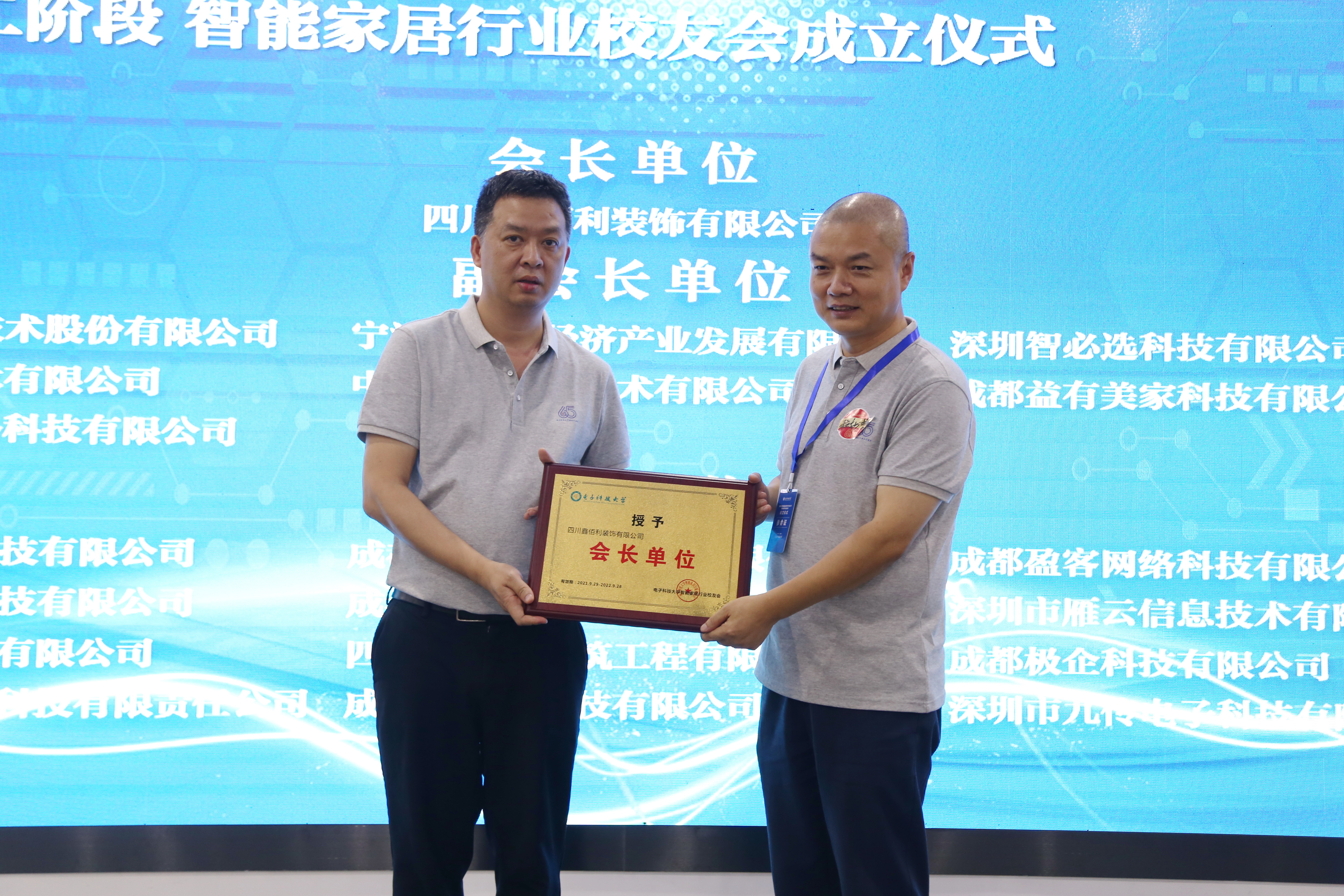 仪式后举行了智能家居行业校友会成立仪式。李会勇宣读了《关于同意智能家居行业校友会成立的函》,并向智能家居行业校友会会长陈新哲校友授牌。会长程新哲、副会长吴飞舟分别向副会长单位、会员单位授牌。