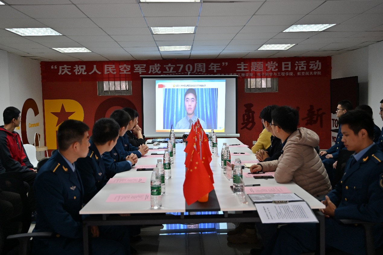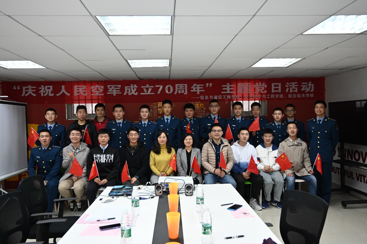 11月11日上午,信通学院国防生党支部、电子学院电波传播与天线本科专业党支部、空天学院国防生党支部联合组织的“庆祝人民空军成立70周年”主题党日活动在学生党员活动室举行。学工部张琼副部长,思想教育科科长李玉纯,学院辅导员,国防生同学共同参与党日活动。