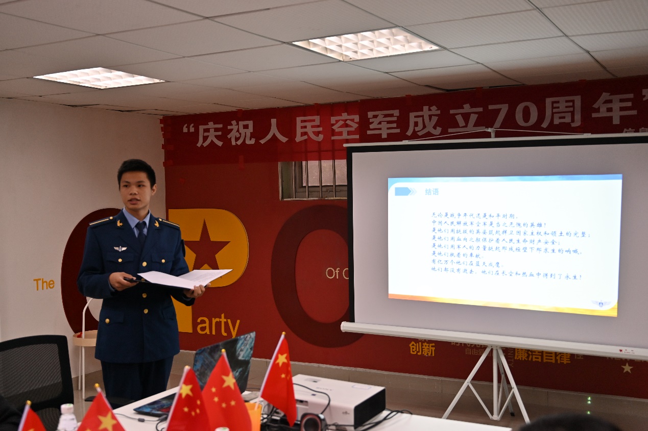 信通学院国防生党支部书记蒋超远同学带领大家回顾人民空军的发展历史。蒋超远从艰难创立、战火中成长、新世纪发展三个方面切入,带领大家学习了一部可歌可泣的空军军史,最后蒋超远勉励大家不忘初心,报效祖国,守卫祖国领空。